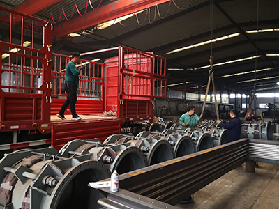 (5) 水平L形管道架空敷設(shè)三個(gè)球墊時(shí),_在每個(gè)球墊下設(shè)置平臺(tái),安裝球墊臺(tái)車(chē),_球墊自由移動(dòng)。此外,在靠近管道的彎頭下設(shè)置足夠長(zhǎng)橫擔(dān)的滑動(dòng)支架,以_管道發(fā)生熱位移時(shí)滑動(dòng)支架不會(huì)脫落。